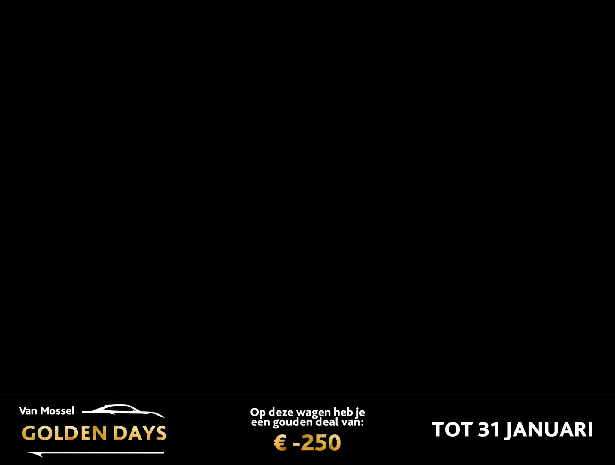 Actie geldig op een selectie tweedehandswagens zolang de voorraad strekt. De €250 directe korting geldt op alle geselecteerde Used Cars op deze actiepagina. Het totale voordeel tot €1.000 is uitsluitend van toepassing bij een geldige offerteaanvraag voor de Gouden Wagen. Kortingen zijn niet cumuleerbaar met andere acties of voorwaarden. Eén voordeel per klant. Beelden en prijzen onder voorbehoud van fouten.